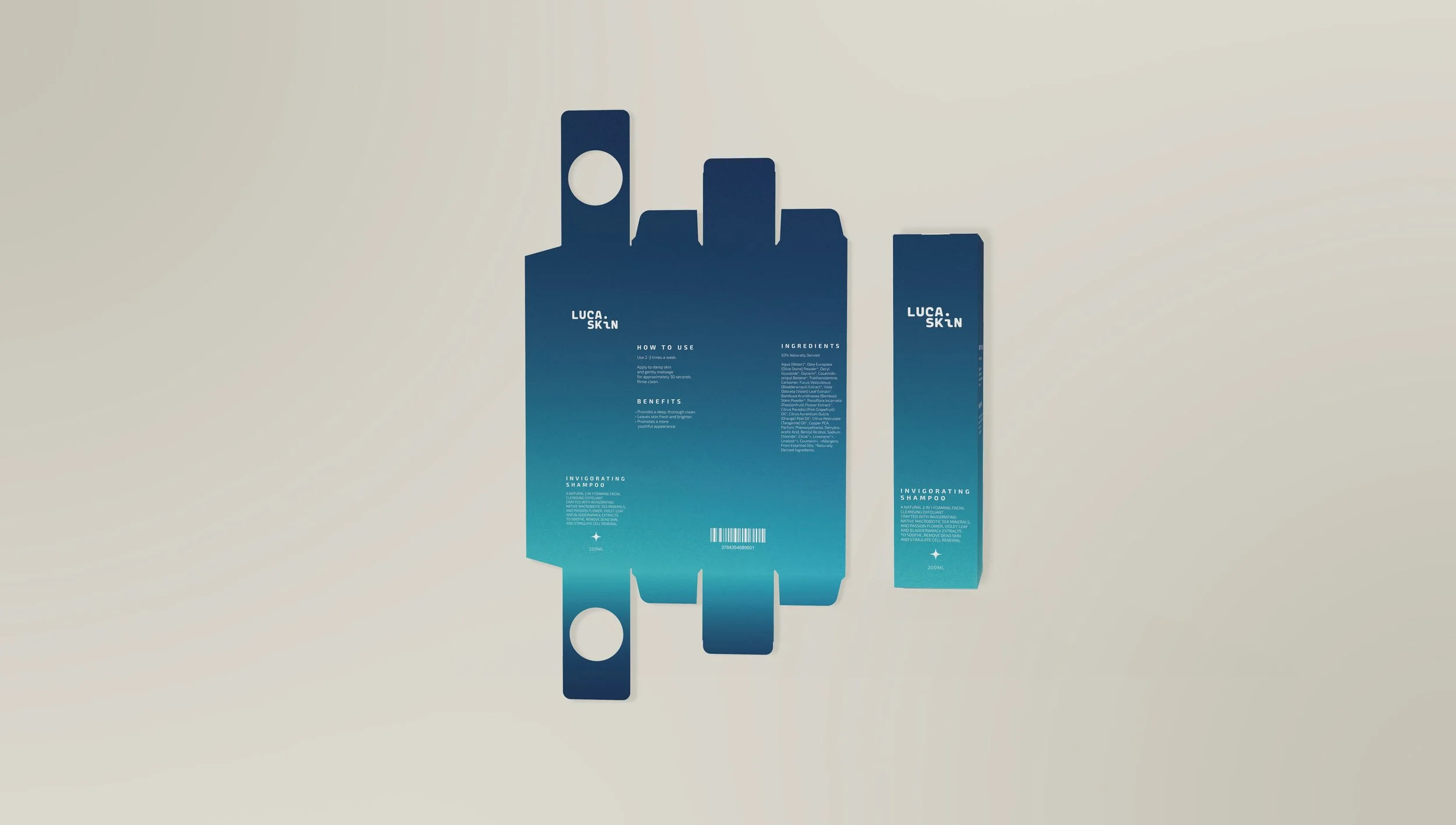 The packaging features deep, cool blue tones with subtle gradients, evoking a sense of freshness, clarity, and masculinity. Clean typography with a bold, futuristic edge reinforces the brand’s sophistication while maintaining simplicity.